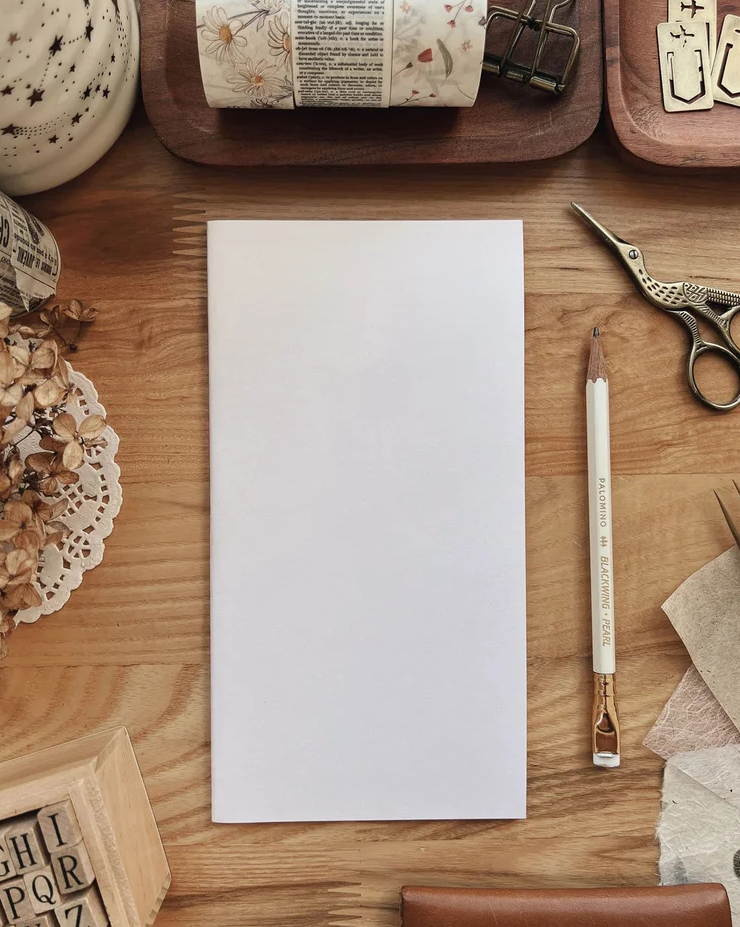 A minimal notebook filled with a hundred pages of subtly gridded Tomoe River Paper. Fits perfectly in a standard Traveler’s Notebook cover.