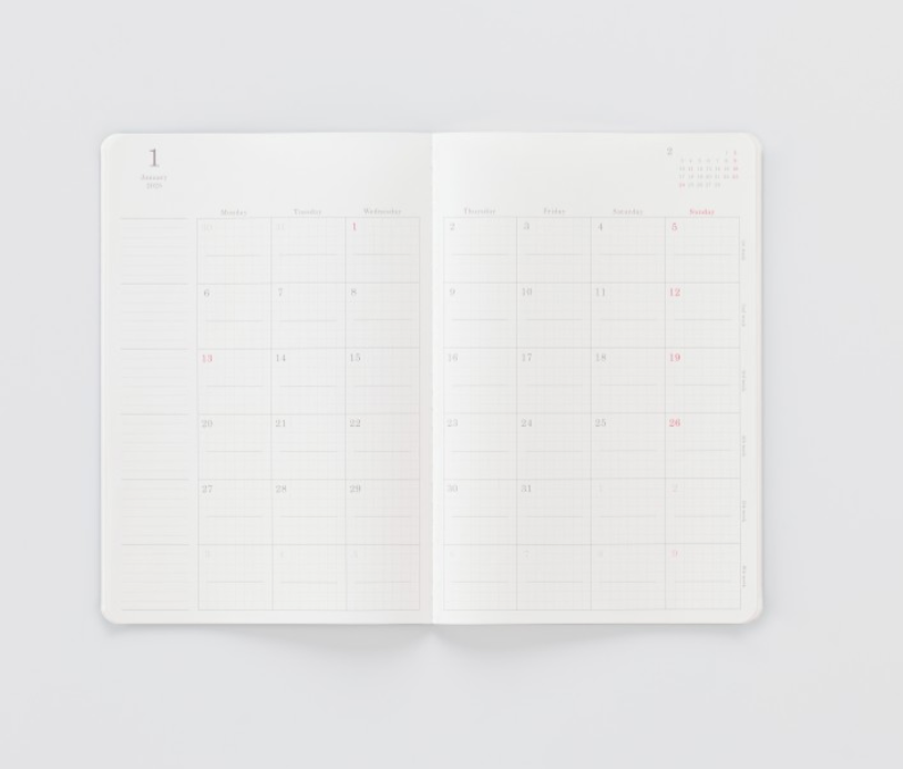 This diary is a monthly dated planner with 4mm gridded pages. The monthly block format divides each day into two halves to make organizing the day easy. The grid lines are printed in a light gray so that it can easily be written or highlighted over. It's A5 Slim size allows you to add the diary onto the inside of any A5 notebook or planner.
