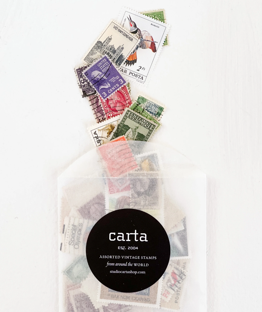 Beautifully aged, vintage stamps from around the world are hand selected for your stationery and craft projects. They are not intended for postage. Each set contains 50 stamps packaged by hand in a glassine envelope. No two sets are alike.